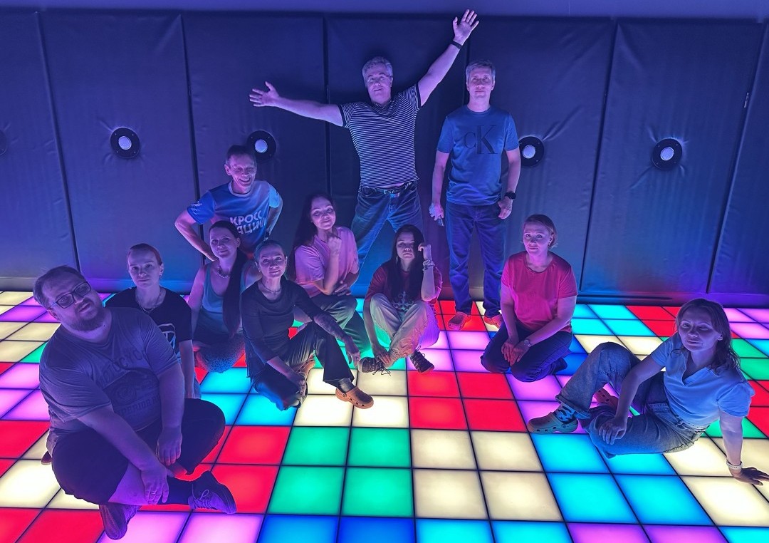 Пройти все испытания на светящемся полу оказалось задачей не из легких, но для тех, кто привык создавать игры, нет ничего невозможного. Мы прокачали ловкость, реакцию и, что самое важное, — командное взаимодействие.